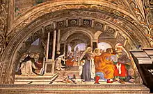 Sur la recommandation de Laurent de Médicis dit « le Magnifique », le cardinal décide de confier la réalisation des fresques de la chapelle à l'artiste florentin presque trentenaire Filippino Lippi. Pour le peintre, il s'agit de son premier grand cycle de fresques et de sa première (et unique) œuvre à Rome[3]. Lippi interrompt ses travaux dans la chapelle Strozzi de Mantoue à la basilique Santa Maria Novella de Florence qu'il avait commencés en 1487 et qu'il achèvera en 1502. Des documents attestent la présence de Lippi à Rome dès le 27 août 1488, en collaboration avec son assistant Raffaellino del Garbo. Comme le pape Alexandre VI effectue une visite officielle à l'église pour la fête de l'Annonciation en mars 1493, il visite la chapelle nouvellement achevée à la fin des cérémonies[4] L'ensemble du programme de la chapelle est un manifeste religieux, héraldique et diplomatique des vertus du cardinal. Les fresques de la petite pièce attenante, destinée à l'origine à abriter la dépouille du cardinal, mais qui n'a jamais été utilisée, sont peintes par Raffaelino del Garbo[5]. Le cycle de fresques raconte l'histoire de Virginie et d'autres thèmes liés à la chasteté.