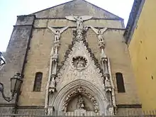 L'entrée est ornée d'un somptueux portail gothique ogival, en marbre blanc et piperno, d'Antonio Baboccio da Piperno, daté de 1415[1]. Celui-ci, riche en motifs floraux et élancé vers le haut, montre sur son sommet le plus élevé l'archange Michel avec le dragon vaincu sous ses pieds ; sur les côtés se trouvent les Archanges Raphaël et Gabriel. Plus bas se trouve le Christ avec le livre éternel, aux pieds duquel il est à nouveau représenté en bas-relief entre des anges et avec un bouclier en acte de couronnement, au centre de la scène se trouvent les armoiries de la famille Anjou-Durazzo de Naples. Plus bas, dans une lunette entourée d'anges sur l'architrave de laquelle, en haut-relief, figure l'Enfant Jésus parmi les évangélistes, entre saint Jean l'Evangéliste et le Baptiste est placée la sculpture de la Vierge à l'Enfant intronisée, et sur le devant une gravure en caractères gothiques angevins. Enfin, les armoiries de la famille Pappacoda sont gravées sur les deux colonnes principales du monument : un lion sur un bouclier, décidé à manger sa queue tordue.