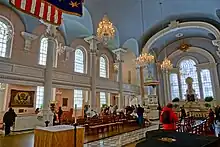 À l'intérieur de la chapelle, les colonnes cannelées des bas-côtés reposent sur des piédestaux et sont surmontées de chapiteaux corinthiens. Le plafond de la nef est voûté et agrémenté de cinq chandeliers en cristal de Waterford datant de 1802[5],[6]. Les fenêtres disposées de part et d'autre de la nef, ainsi que les couleurs, rendent l'intérieur très lumineux. Une peinture représentant le Grand sceau des États-Unis est accrochée au-dessus du banc où s'asseyait George Washington lorsqu'il venait dans l'église[1],[14]. Le buffet d'orgues en acajou conçu par John Geib date de 1804 et l'orgue a été restauré à plusieurs reprises en 1950, 1964 et 1981[16]. Il est resté silencieux entre 2001 et 2009[16].