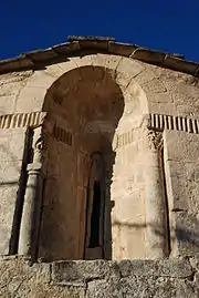 Le chevet est percé de trois fenêtres dont la plus importante présente une très intéressante décoration. Cette fenêtre est constituée d'une ouverture très étroite placée au fond d'une loge en pierre de taille encadrée de deux colonnettes monolithes assez primitives et très différentes l'une de l'autre, qui constituent certainement un remploi[3] d'époque antérieure. Les chapiteaux de ces colonnettes sont surmontés d'une frise de dents d'engrenage qui se prolonge tant à l'intérieur de la loge qu'à l'extérieur de celle-ci.