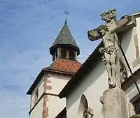 Au droit de la sacristie se trouve un Christ en croix datant de 1687 appelée localement la Croix miraculeuse. Le visage du Christ évoque simultanément la douleur et la miséricorde. Son regard semble également suivre le visiteur dans toutes les directions.