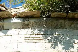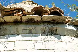 La corniche de l'abside est ornée de motifs sculptés, végétaux ou géométriques, dont l'un, énigmatique, semble figurer une pioche et trois portes cintrées.