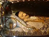 Le corps de Vincent de Paul, mort le , se trouvait intact à l'exception des yeux et du nez en 1712, soit 52 ans après son décès. En 1737, seul subsistait le squelette. Ces reliques ont pu être cachées et échapper à la tourmente révolutionnaire. Sur le squelette conservé, ont été remodelés le visage et les mains recouverts de cire, de sorte que Vincent de Paul a l'air de reposer paisiblement, revêtu de ses habits sacerdotaux. La croix placée entre ses mains est celle avec laquelle il donna l'extrême-onction au roi Louis XIII mourant[2]. Le cœur de Vincent de Paul est conservé séparément dans la chapelle des Filles-de-la-Charité située, juste à proximité, au 140 rue du Bac dans le 7e arrondissement.