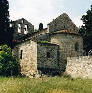 L'abside, édifiée en pierre de taille assemblée en très grand appareil, est percée d'une fenêtre axiale à simple ébrasement et est surmontée d'une corniche moulurée. Elle est adossée à un haut pignon percé d'une petite baie rectangulaire.