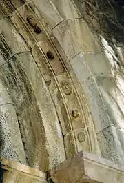 La voussure externe porte une moulure ornée de boules, de masques humains et de personnages fantastiques comme l'on en trouve en Cerdagne, Llo ou à Saga par exemple. La seconde voussure est ornée d'un motif de tresses.