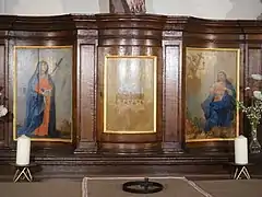 - L’autel tripartite date probablement du XVIIIe siècle. Un petit retable sur bois illustre en trois tableaux : l’Agneau pascal (au centre), la Vierge Marie dont le cœur est transpercé d’un glaive et Jésus en agonie auquel un ange présente un calice. Les panneaux peints et les boiseries ont également été restaurés.