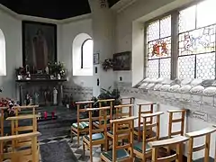 - Plusieurs vitraux portent les armoiries du baron de Crawhez. Au dessus de l’autel de marbre, se trouve une toile du peintre Jean Julémont (1904-1979). Dans une niche, des reliques de la sainte de Lisieux.