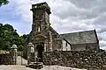 Ancienne église tréviale de Plouguernevez. L'édifice actuel est de plan rectangulaire, et comprend une chapelle au sud du chœur. Des fenestrages du XIVe siècle réemployés dans la nef et au pignon de la chapelle, laissent supposer qu'un édifice existait déjà au XIVe siècle, sans doute endommagé par la guerre de succession du duché. Au début du XVe siècle, reconstruction de l'édifice. Au XIXe siècle, ajout d'une sacristie au nord. Le porche de la tour s'orne d'une voûte à liernes tardive, décorée de la colombe du Saint-Esprit. Elle date du XVIIIe siècle, de même que le pignon adjacent. La flèche qui la surmontait était datée de 1720, mais s'est écroulée en 1877[1].