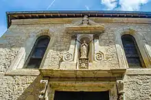 Le portail est surmonté d’une niche encadrée par deux ailerons (pilastres formant volute en bas) terminés par des chapiteaux à feuillages. Un fronton triangulaire orné de trois boules, à l’intérieur duquel se trouve un balustre typique de la région lectouroise aux XVIIe et XVIIIe siècles, domine l’ensemble. La niche contient une statue de la Vierge XIXe s., reposant sur un blason portant les armes du Carmel, également ajouté au XIXe s.