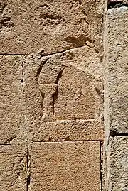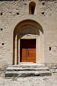 On trouve un curieux rappel de l'arc encadrant la figure centrale du linteau à droite de la porte, à environ deux mètres de celle-ci, sous la forme d'un bloc de pierre de taille orné d'une colonne et d'un fragment d'arc en plein cintre.