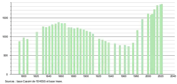L'évolution du nombre d'habitants est connue à travers les recensements de la population effectués dans la commune depuis 1793. Pour les communes de moins de 10 000 habitants, une enquête de recensement portant sur toute la population est réalisée tous les cinq ans, les populations légales des années intermédiaires étant quant à elles estimées par interpolation ou extrapolation[27]. Pour la commune, le premier recensement exhaustif entrant dans le cadre du nouveau dispositif a été réalisé en 2004[28].