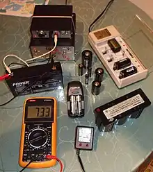 - Le chargeur peut être une source de courant constante (en ampères), la tension augmentant au fur et à mesure de la charge ; ce type de chargeur implique généralement une maîtrise scrupuleuse du temps de charge, sous peine de dégradation des accumulateurs. Voir formule du calcul du temps de charge.