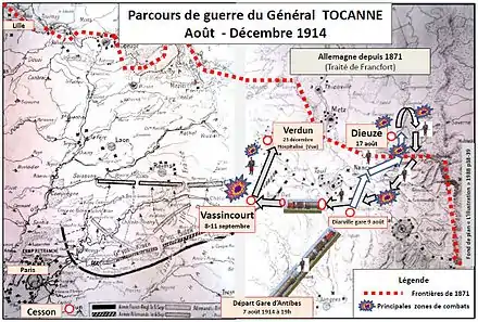 Cette brigade participe à la bataille de la trouée de Revigny[6], aux combats de Vassincourt[7],[8], et à la victoire lors de la bataille de la Marne le . Il quitte le champ de bataille près de Verdun le pour raison de santé : décollement de la rétine.