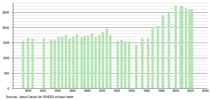 L'évolution du nombre d'habitants est connue à travers les recensements de la population effectués dans la commune depuis 1793. Pour les communes de moins de 10 000 habitants, une enquête de recensement portant sur toute la population est réalisée tous les cinq ans, les populations légales des années intermédiaires étant quant à elles estimées par interpolation ou extrapolation[30]. Pour la commune, le premier recensement exhaustif entrant dans le cadre du nouveau dispositif a été réalisé en 2008[31].