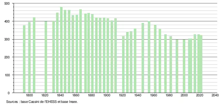 L'évolution du nombre d'habitants est connue à travers les recensements de la population effectués dans la commune depuis 1793. Pour les communes de moins de 10 000 habitants, une enquête de recensement portant sur toute la population est réalisée tous les cinq ans, les populations légales des années intermédiaires étant quant à elles estimées par interpolation ou extrapolation[17]. Pour la commune, le premier recensement exhaustif entrant dans le cadre du nouveau dispositif a été réalisé en 2008[18].