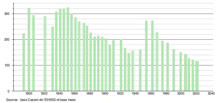 L'évolution du nombre d'habitants est connue à travers les recensements de la population effectués dans la commune depuis 1793. Pour les communes de moins de 10 000 habitants, une enquête de recensement portant sur toute la population est réalisée tous les cinq ans, les populations légales des années intermédiaires étant quant à elles estimées par interpolation ou extrapolation[22]. Pour la commune, le premier recensement exhaustif entrant dans le cadre du nouveau dispositif a été réalisé en 2005[23].