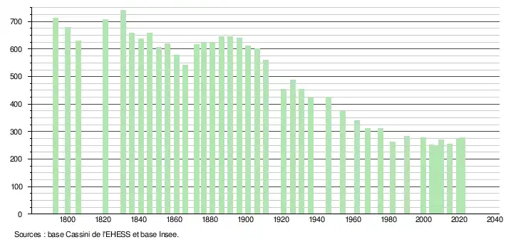 L'évolution du nombre d'habitants est connue à travers les recensements de la population effectués dans la commune depuis 1793. Pour les communes de moins de 10 000 habitants, une enquête de recensement portant sur toute la population est réalisée tous les cinq ans, les populations légales des années intermédiaires étant quant à elles estimées par interpolation ou extrapolation[14]. Pour la commune, le premier recensement exhaustif entrant dans le cadre du nouveau dispositif a été réalisé en 2004[15].