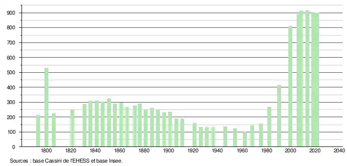 L'évolution du nombre d'habitants est connue à travers les recensements de la population effectués dans la commune depuis 1793. Pour les communes de moins de 10 000 habitants, une enquête de recensement portant sur toute la population est réalisée tous les cinq ans, les populations légales des années intermédiaires étant quant à elles estimées par interpolation ou extrapolation[19]. Pour la commune, le premier recensement exhaustif entrant dans le cadre du nouveau dispositif a été réalisé en 2008[20].