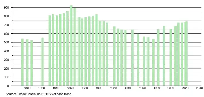 L'évolution du nombre d'habitants est connue à travers les recensements de la population effectués dans la commune depuis 1793. Pour les communes de moins de 10 000 habitants, une enquête de recensement portant sur toute la population est réalisée tous les cinq ans, les populations légales des années intermédiaires étant quant à elles estimées par interpolation ou extrapolation[17]. Pour la commune, le premier recensement exhaustif entrant dans le cadre du nouveau dispositif a été réalisé en 2005[18].
