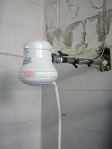 Il y a une large gamme de douches électriques, avec différents types de commandes de chauffage. L'élément chauffant d'une douche électrique est immergé dans le courant d'eau, en utilisant un élément de résistance de nichrome gainé et isolé électriquement, comme ceux utilisés dans les radiateurs à huile, les radiateurs ou les fers à repasser, assurant sécurité. En raison des normes de sécurité électrique, les douches électriques modernes sont faites de plastique au lieu d'utiliser des boîtiers métalliques comme par le passé. Comme un appareil électrique qui utilise plus de courant électrique qu'une laveuse ou une sécheuse, une installation de douche électrique nécessite une planification minutieuse, et est généralement destinée à être câblée directement à partir du boîtier de distribution électrique avec un disjoncteur et un système de mise à la terre. Un système mal installé avec de vieux fils en aluminium ou de mauvaises connexions peut être dangereux, car les fils peuvent surchauffer ou le courant électrique peut fuir par le filet d'eau à travers le corps de l'utilisateur jusqu'à la terre[4].