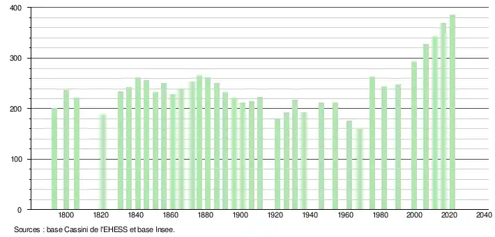 L'évolution du nombre d'habitants est connue à travers les recensements de la population effectués dans la commune depuis 1793. Pour les communes de moins de 10 000 habitants, une enquête de recensement portant sur toute la population est réalisée tous les cinq ans, les populations légales des années intermédiaires étant quant à elles estimées par interpolation ou extrapolation[20]. Pour la commune, le premier recensement exhaustif entrant dans le cadre du nouveau dispositif a été réalisé en 2006[21].