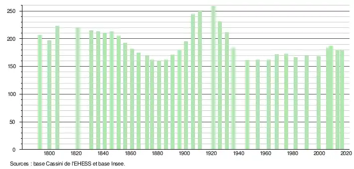 L'évolution du nombre d'habitants est connue à travers les recensements de la population effectués dans la commune depuis 1793. Pour les communes de moins de 10 000 habitants, une enquête de recensement portant sur toute la population est réalisée tous les cinq ans, les populations légales des années intermédiaires étant quant à elles estimées par interpolation ou extrapolation[1]. Pour la commune, le premier recensement exhaustif entrant dans le cadre du nouveau dispositif a été réalisé en 2008[2].