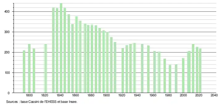L'évolution du nombre d'habitants est connue à travers les recensements de la population effectués dans la commune depuis 1793. Pour les communes de moins de 10 000 habitants, une enquête de recensement portant sur toute la population est réalisée tous les cinq ans, les populations légales des années intermédiaires étant quant à elles estimées par interpolation ou extrapolation[17]. Pour la commune, le premier recensement exhaustif entrant dans le cadre du nouveau dispositif a été réalisé en 2007[18].