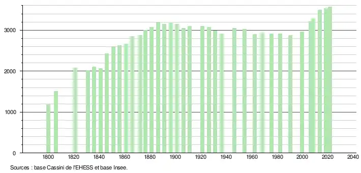L'évolution du nombre d'habitants est connue à travers les recensements de la population effectués dans la commune depuis 1800. Pour les communes de moins de 10 000 habitants, une enquête de recensement portant sur toute la population est réalisée tous les cinq ans, les populations légales des années intermédiaires étant quant à elles estimées par interpolation ou extrapolation[24]. Pour la commune, le premier recensement exhaustif entrant dans le cadre du nouveau dispositif a été réalisé en 2008[25].