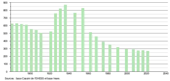 L'évolution du nombre d'habitants est connue à travers les recensements de la population effectués dans la commune depuis 1881. Pour les communes de moins de 10 000 habitants, une enquête de recensement portant sur toute la population est réalisée tous les cinq ans, les populations légales des années intermédiaires étant quant à elles estimées par interpolation ou extrapolation[18]. Pour la commune, le premier recensement exhaustif entrant dans le cadre du nouveau dispositif a été réalisé en 2006[19].