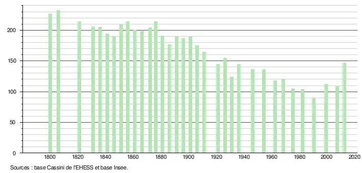 L'évolution du nombre d'habitants est connue à travers les recensements de la population effectués dans la commune depuis 1800. À partir du , les populations légales des communes sont publiées annuellement dans le cadre d'un recensement qui repose désormais sur une collecte d'information annuelle, concernant successivement tous les territoires communaux au cours d'une période de cinq ans. Pour les communes de moins de 10 000 habitants, une enquête de recensement portant sur toute la population est réalisée tous les cinq ans, les populations légales des années intermédiaires étant quant à elles estimées par interpolation ou extrapolation[3]. Pour la commune, le premier recensement exhaustif entrant dans le cadre du nouveau dispositif a été réalisé en 2007[4],[Note 1].