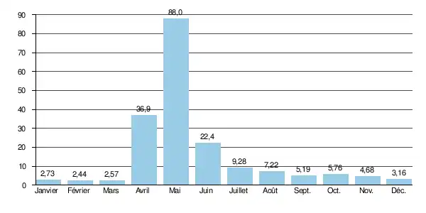 Le débit moyen mensuel observé en février (minimum annuel d'étiage) atteint 2,44 m3/s, ce qui représente moins de 3 % du débit moyen du mois de mai (88,0 m3/s). L'amplitude des variations saisonnières peut être qualifiée de fort élevée, même dans le contexte du bassin de l'Ob caractérisé par des écarts souvent fort importants. Sur la période d'observation de 46 ans, le débit mensuel minimal a été de 0,81 m3/s en , tandis que le débit mensuel maximal s'est élevé à 300 m3/s en .