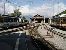 Le dépôt d'Aigle avec des automotrices aux anciennes couleurs.