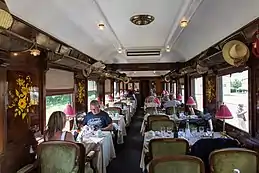 - Un fourgon mixte à deux essieux et à trois compartiments B3Dt SNCF ex A6t Ouest, qui fournit l'énergie aux voitures-restaurant.