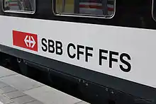 Jusqu’en 1971, l'emblème des CFF consistait en une roue ailée, plus ou moins stylisée au fil des révisions. En 1972, le graphiste bernois Hans Hartmann (de) conçoit la croix, dont les bras latéraux sont prolongés par une flèche. Le logo actuel (flèche blanche sur fond rouge et sigle de la société dans les trois langues officielles du pays, écrit en noir sur blanc en Helvetica) date de 1982 et est l'œuvre de l'atelier du graphiste Josef Müller-Brockmann. La croix blanche est un symbole bien connu de la Suisse, et les flèches représentent le transport d’un point à un autre du pays[43]. Quant à la police Helvetica, son nom est évidemment l'adjectif latin signifiant « suisse », au féminin.