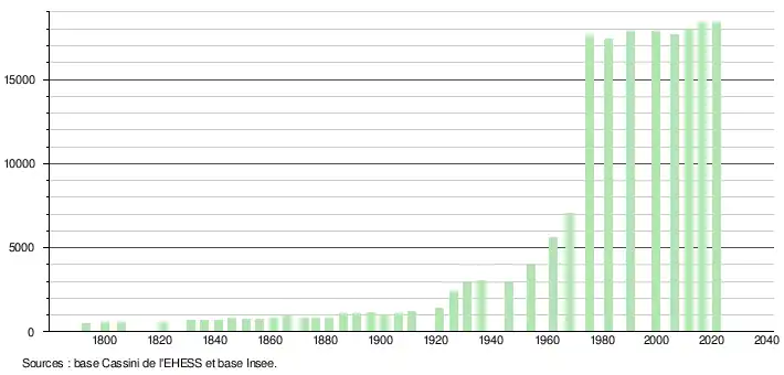 - Par convention dans Wikipédia, le principe a été retenu de n’afficher dans le tableau des recensements et le graphique, pour les populations légales postérieures à 1999, que les populations correspondant à une enquête exhaustive de recensement pour les communes de moins de 10 000 habitants, et que les populations des années 2006, 2011, 2016, etc. pour les communes de plus de 10 000 habitants, ainsi que la dernière population légale publiée par l’Insee pour l'ensemble des communes.