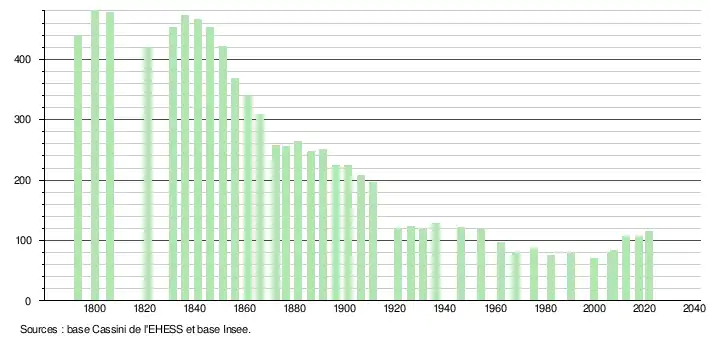 L'évolution du nombre d'habitants est connue à travers les recensements de la population effectués dans la commune depuis 1793. Pour les communes de moins de 10 000 habitants, une enquête de recensement portant sur toute la population est réalisée tous les cinq ans, les populations légales des années intermédiaires étant quant à elles estimées par interpolation ou extrapolation[31]. Pour la commune, le premier recensement exhaustif entrant dans le cadre du nouveau dispositif a été réalisé en 2007[32].