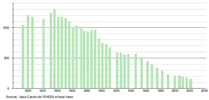 L'évolution du nombre d'habitants est connue à travers les recensements de la population effectués dans la commune depuis 1793. Pour les communes de moins de 10 000 habitants, une enquête de recensement portant sur toute la population est réalisée tous les cinq ans, les populations légales des années intermédiaires étant quant à elles estimées par interpolation ou extrapolation[20]. Pour la commune, le premier recensement exhaustif entrant dans le cadre du nouveau dispositif a été réalisé en 2005[21].