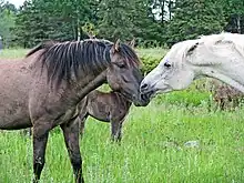 Les contacts entre chevaux peuvent être agressifs (morsure, coup de pied, bousculades) ou bien démontrer une affinité entre congénères, un exemple étant le toilettage mutuel. Le cheval analyse des odeurs en effectuant un flehmen, comportement particulier de flairage permettant l'activation de l'organe voméro-nasal qui a la particularité de détecter les phéromones. La possibilité d'une communication par télépathie est parfois évoquée[64]. Cette communication intuitive permettrait au cheval de ressentir l'état d'esprit de ses congénères et des humains[65]. Cette hypothèse n'est pas reconnue par la communauté scientifique[66].