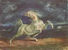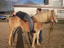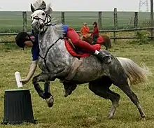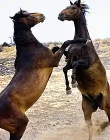 Le cheval saute naturellement les obstacles qui se présentent à lui, et effectue parfois des sauts sur place[78]. Il connaît le cabrer et la ruade, mouvements qui témoignent généralement d'une volonté d'attaque ou de défense de sa part[79].