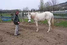 Le cheval communique généralement par le canal visuel, grâce au langage corporel. L'étude de sa gestuelle, des mouvements d'oreilles et des attitudes de sa tête permet de déterminer son humeur. Il couche ses oreilles en arrière s'il est en colère, et les pointe vers l'avant s'il est attentif[60]. Il emploie le hennissement lorsqu'il ne peut pas voir d'autres chevaux[61], le plus souvent afin de les appeler[62]. Les chevaux recourent au hennissement dès leur plus jeune âge, c'est un moyen pour eux d'exprimer des émotions fortes[63].