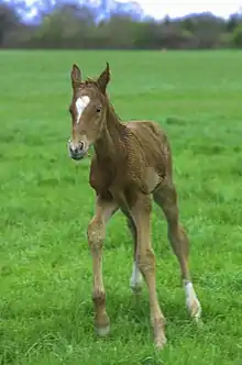 La durée de gestation est en moyenne de onze mois, soit 330 jours[72]. La jument donne naissance à un poulain à la fois, sauf exception, généralement au printemps. Il peut marcher moins d'une heure après la naissance, et doit téter le colostrum de sa mère avant deux jours[73].