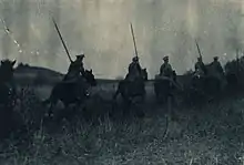 Après avoir vu les exploits des unités montées des Boers en Afrique du Sud durant la Seconde Guerre des Boers entre 1899 et 1902, la Grande-Bretagne augmente ses réserves de cavalerie[6]. Elles sont utilisées dès les premiers jours de la Première Guerre mondiale. Le , le premier tir britannique en Belgique est effectué par un cavalier, Edward Thomas, des 4th Royal Irish Dragoon Guards à côté de Casteau, durant une patrouille la veille de la bataille de Mons[7]. Dix-neuf jours après la première mobilisation anglo-saxonne, le , le régiment du 9th Queen's Royal Lancers, mené par David Campbell, attaque des troupes d'infanterie allemandes avec un escadron du 4th Dragoon Guards. Campbell suit les ordres qui sont de charger les lignes ennemies, même s'il pense qu'il aurait été plus prudent de se battre à pied. Les Britanniques y perdent 250 hommes et 300 chevaux. Le 7 septembre, ses troupes attaquent une nouvelle fois, cette fois-ci face au Premier corps des dragons allemand, un autre régiment de lanciers[8]. La même année, la Household Cavalry britannique accomplit son avant-dernière opération à dos de cheval, durant la Grande Retraite des Alliés. Après avoir atteint l'Aisne et la ligne de tranchées, les cavaliers se révèlent inefficaces. Alors que des divisions montées sont toujours formées en Grande-Bretagne, celles du front s'habituent rapidement à se battre à pied[9]. Les Britanniques continuent d'en utiliser tout au long de la guerre, et en 1917, la Household Cavalry lance la dernière charge à cheval dans une attaque de diversion sur la Ligne Hindenburg, près d'Arras. Sur les ordres du Field Marshal Douglas Haig, les Life Guards et Horse guards, accompagnés par les hommes de la 10th Royal Hussars, attaquent sous les tirs massifs des mitrailleuses allemandes et à travers les fils de fer barbelé. Les hussards y perdent les deux-tiers de leurs hommes[9],[El 2]. La dernière perte pour la cavalerie britannique avant l'armistice avec l'Allemagne est celle de George Edwin Ellison, de la troupe C du 5th Royal Irish Lancers, tué par un tireur d'élite, alors que son régiment se dirigeait vers Mons, le [10].