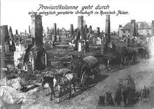 | Sur la gauche de la route, des convois de munitions, des prolonges tirées par de gros percherons, roulent au trot, dans un fracas d'enfer. De toutes les ruelles affluent des charrettes, tirées par des ânes, des chevaux. [...] Des attelages civils se glissent au milieu des trains régimentaires qui vont au pas et dont la file occupe le centre de la chaussée[64]. |
