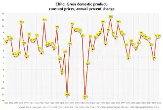 Pinochet confie l’économie du pays aux théoriciens de l'école de Chicago, les Chicago boys, de jeunes économistes chiliens comme José Piñera et Hernán Büchi, souvent formés à l'Université de Chicago et adeptes des idées de Milton Friedman et d'Arnold Harberger[47]. Après une baisse du PIB de 10 % entre 1973 et 1975[48], la croissance atteindra 8 % par an entre 1977 et 1980[49] au prix d'un endettement extérieur et d'une inflation très élevés, et le chômage augmente fortement. Une très grave crise économique touche le Chili entre 1982 et 1985 ; sous l’influence de la hausse mondiale de l'inflation, l’inflation nationale atteint 27,3 % en 1982[50], et le pays connaît sa pire récession depuis les années 1930[51]. De 1982 à 1984, le PIB baisse de 16 %[48]. La crise provoque une série de protestations de la population contre le régime politique et le libéralisme économique. Le chômage, qui touche en moyenne 18 % de la population active pour l'ensemble de la période du régime militaire, culmine à environ 30 % en 1983[48],[52]. L’économie du pays revient au vert à partir de 1985, permettant de résorber l'important déficit financier extérieur accumulé à la fin des années 1970 et d'équilibrer les finances publiques[48], mais les manifestations (« protestas »), réprimées dans le sang, se poursuivent contre la dictature.
