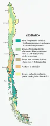 Le Chili possède l’une des cinq écorégions méditerranéennes du monde ; ses hivers tempérés et ses étés secs et chauds offrent des conditions idéales pour l’agriculture et autres activités de production[pertinence contestée]. Le pays est cependant fortement menacé par le changement climatique et a perdu au moins 37 % de ses ressources hydriques depuis le début des années 1990[pertinence contestée][12].