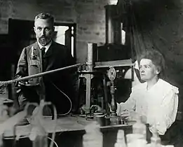 Les travaux de Joseph John Thomson, découvreur de l'électron en 1897, prouvent que l'atome est constitué de particules électriquement chargées. Ernest Rutherford démontre par sa célèbre expérience en 1909 que l'atome est surtout composé de vide, son noyau, massif, très petit et positif, étant entouré d'un nuage électronique. Marie Curie obtient le prix Nobel de chimie en 1911 pour ses travaux sur le polonium et le radium[24].