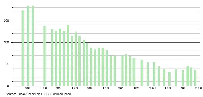 L'évolution du nombre d'habitants est connue à travers les recensements de la population effectués dans la commune depuis 1793. Pour les communes de moins de 10 000 habitants, une enquête de recensement portant sur toute la population est réalisée tous les cinq ans, les populations légales des années intermédiaires étant quant à elles estimées par interpolation ou extrapolation[3]. Pour la commune, le premier recensement exhaustif entrant dans le cadre du nouveau dispositif a été réalisé en 2005[4].