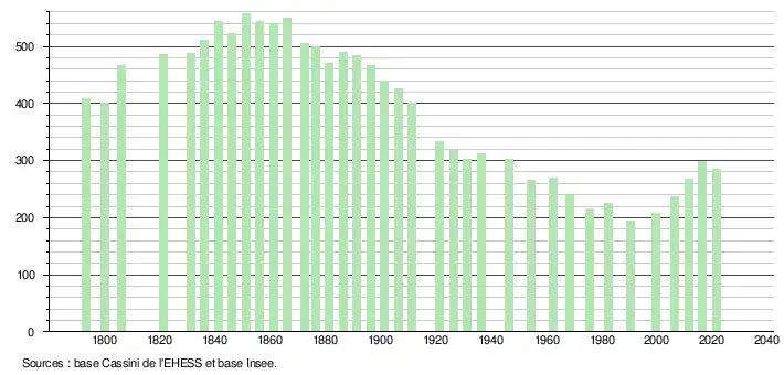 L'évolution du nombre d'habitants est connue à travers les recensements de la population effectués dans la commune depuis 1793. Pour les communes de moins de 10 000 habitants, une enquête de recensement portant sur toute la population est réalisée tous les cinq ans, les populations légales des années intermédiaires étant quant à elles estimées par interpolation ou extrapolation[17]. Pour la commune, le premier recensement exhaustif entrant dans le cadre du nouveau dispositif a été réalisé en 2006[18].
