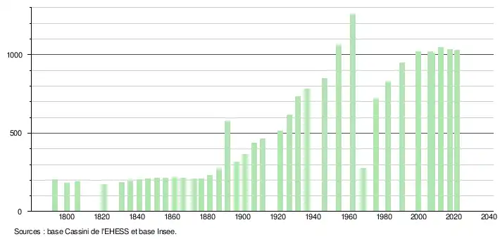 L'évolution du nombre d'habitants est connue à travers les recensements de la population effectués dans la commune depuis 1793. Pour les communes de moins de 10 000 habitants, une enquête de recensement portant sur toute la population est réalisée tous les cinq ans, les populations légales des années intermédiaires étant quant à elles estimées par interpolation ou extrapolation[19]. Pour la commune, le premier recensement exhaustif entrant dans le cadre du nouveau dispositif a été réalisé en 2007[20].