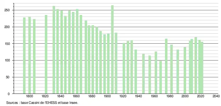 L'évolution du nombre d'habitants est connue à travers les recensements de la population effectués dans la commune depuis 1793. Pour les communes de moins de 10 000 habitants, une enquête de recensement portant sur toute la population est réalisée tous les cinq ans, les populations légales des années intermédiaires étant quant à elles estimées par interpolation ou extrapolation[15]. Pour la commune, le premier recensement exhaustif entrant dans le cadre du nouveau dispositif a été réalisé en 2008[16].